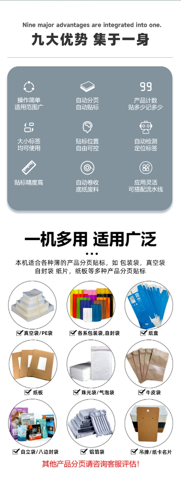 東莞鼎業(yè)機(jī)械有限公司的貼標(biāo)機(jī):自動分頁智能易編機(jī),針對預(yù)制袋、未成形前紙盒、卡片等片狀物料進(jìn)行分頁、打碼,可打印條碼、可變數(shù)據(jù)、日期、時間、批號、圖案、流水號等。