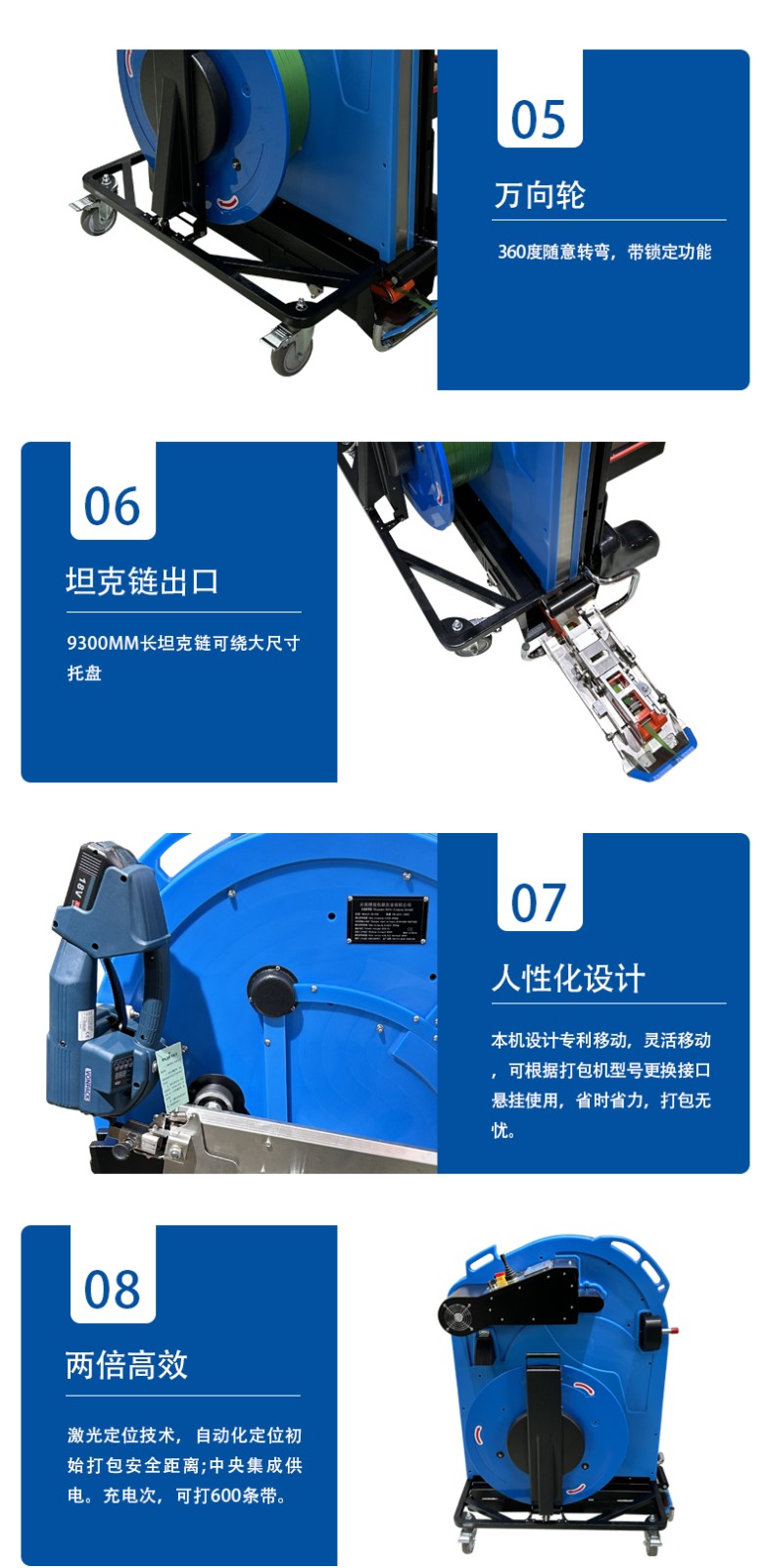 設(shè)備圍繞 “貨物 - 托盤一體化固定” 展開,核心功能覆蓋打包全環(huán)節(jié),無需人工干預(yù)關(guān)鍵動(dòng)作: