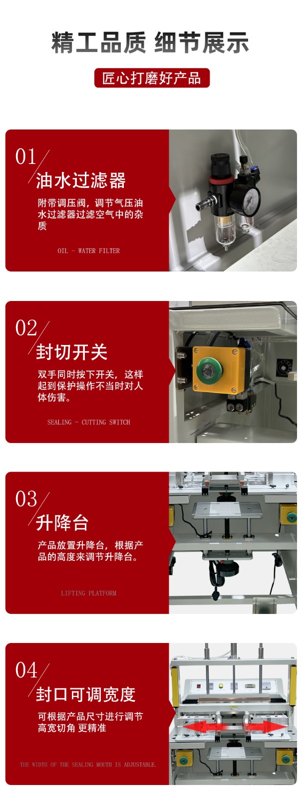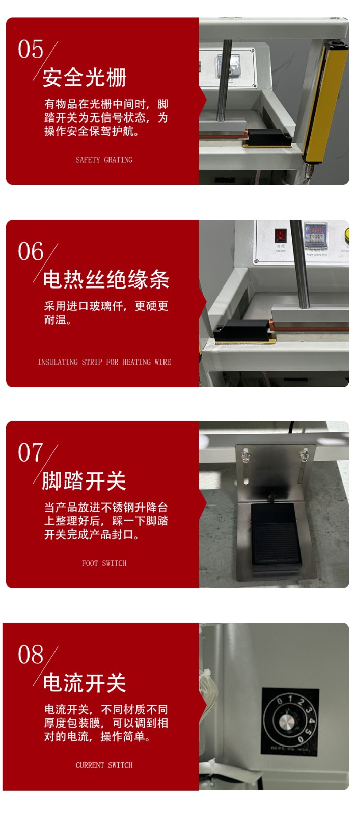 高效快捷:封口速度比傳統(tǒng)設備快,部分機型每分鐘可完成 50 次精準封口,能有效提高生產(chǎn)效率。 操作簡便:通常采用一鍵啟動或腳踏開關控制,操作人員只需簡單培訓即可上手操作。 封口質(zhì)量好:采用雙面加熱封口,壓合平整美觀,封口牢固,且封口長度、寬度等參數(shù)可根據(jù)需求調(diào)整。 適應性強:可適用于 PVC、PP、POF 等多種材質(zhì)的收縮膜,還能根據(jù)不同產(chǎn)品規(guī)格進行調(diào)整,兼容多種尺寸的包裝材料。 安全性高:部分機型配備急停按鈕等安全裝置,且外觀設計圓潤,無棱角,可減少操作人員受傷的風險。 應用場景 廣泛應用于食品、化工、電子、醫(yī)藥、日化等行業(yè),可用于對各種產(chǎn)品的包裝材料進行封口和切角處理,如食品包裝袋、日化用品包裝袋、電子產(chǎn)品包裝盒等的封裝。 代表產(chǎn)品 如中堡智能科技實業(yè)有限公司的HX-4018 智能氣動封口切角機、東莞博冠包裝實業(yè)有限公司的氣動封口切角機等,均具有運行穩(wěn)定、包裝速度快、多規(guī)格適配等特點。