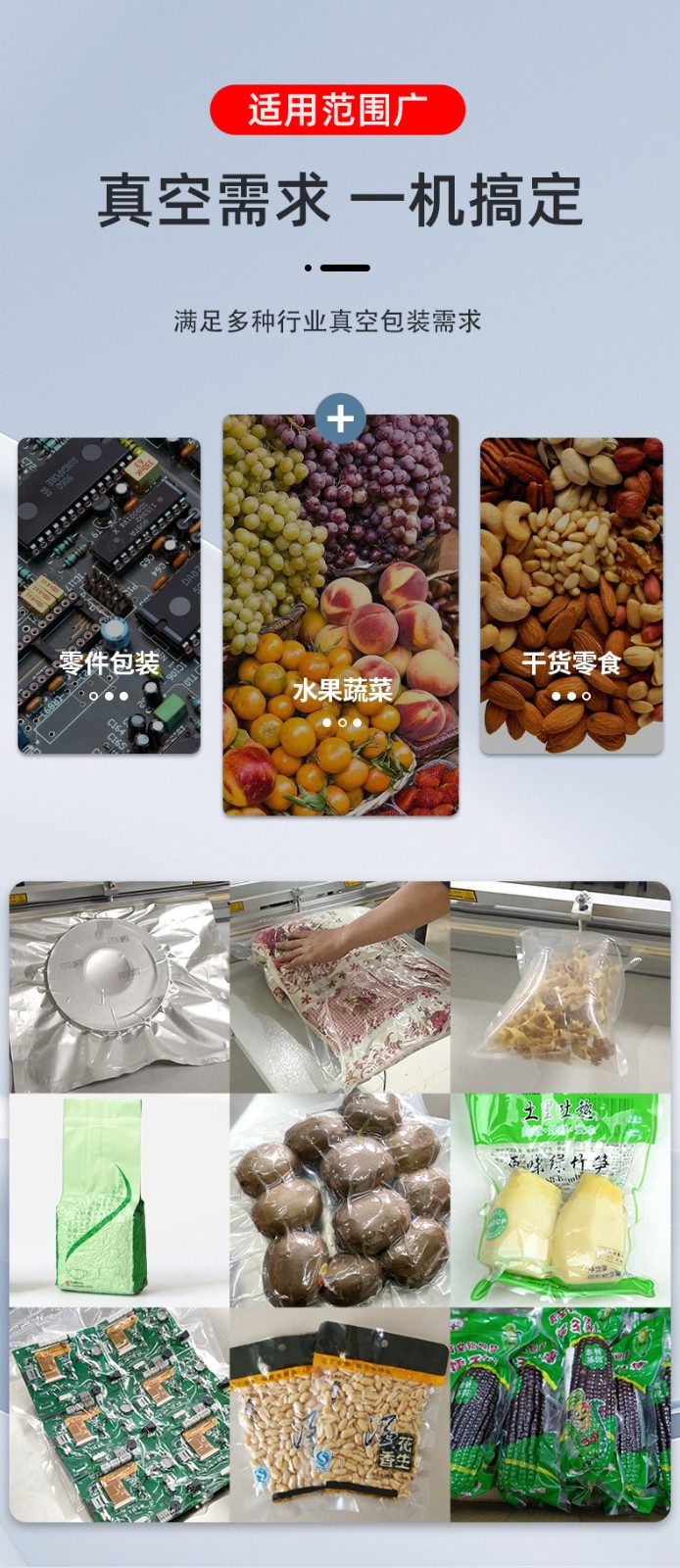• 工業(yè)領(lǐng)域:可真空包裝大型機(jī)械零件(防銹)、整箱電子元件(防塵),部分機(jī)型支持調(diào)節(jié)抽真空力度,避免損壞精密組件。