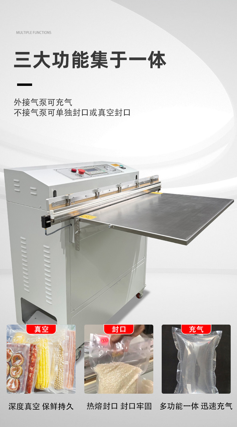 多功能一體的外抽真空包裝機(jī),是在基礎(chǔ)外抽真空功能上,整合了充氣保鮮、封口、印字等多種功能的設(shè)備,能一站式滿足不同物品的包裝需求,核心優(yōu)勢是功能集成度高、場景適配性強(qiáng),無需額外購置多臺設(shè)備。