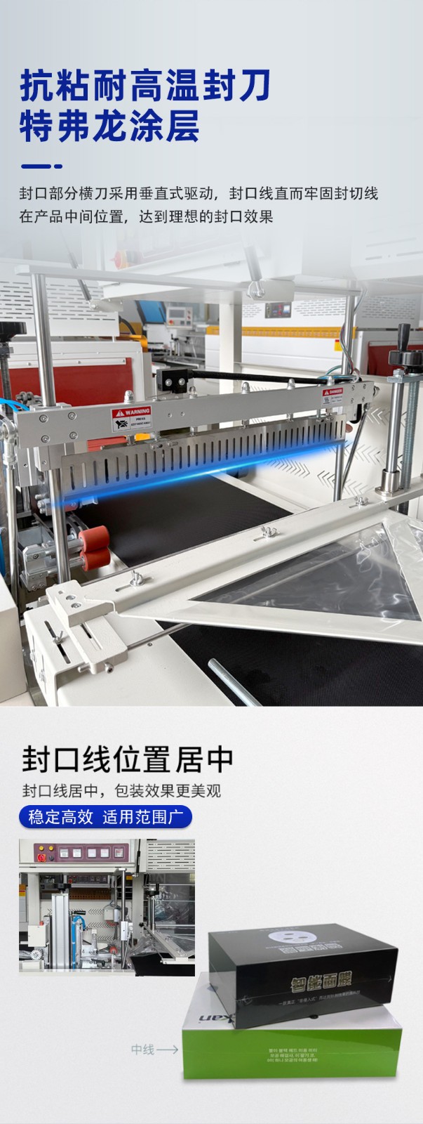• 封口性能好:封切刀通常采用美國杜邦特弗龍防粘涂層,封口不會開裂、焦化,且?guī)в凶詣颖Wo(hù)功能,可防止誤切包裝物。