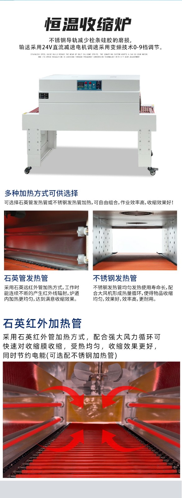 - 溫度控制精確:通常采用數(shù)顯溫控儀和進口熱敏感應(yīng)控制,溫度可在 0-300℃范圍內(nèi)調(diào)節(jié),溫度控制精度可達 ±2℃,確保熱收縮效果穩(wěn)定。
