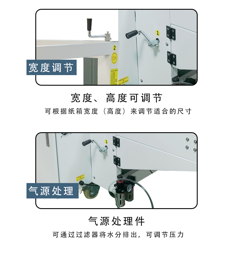 • 紙箱適應(yīng)性強:適用紙箱范圍廣,不同大小紙箱調(diào)整簡便快捷,變換紙箱規(guī)格時,手動調(diào)整一般只需 1-2 分鐘。