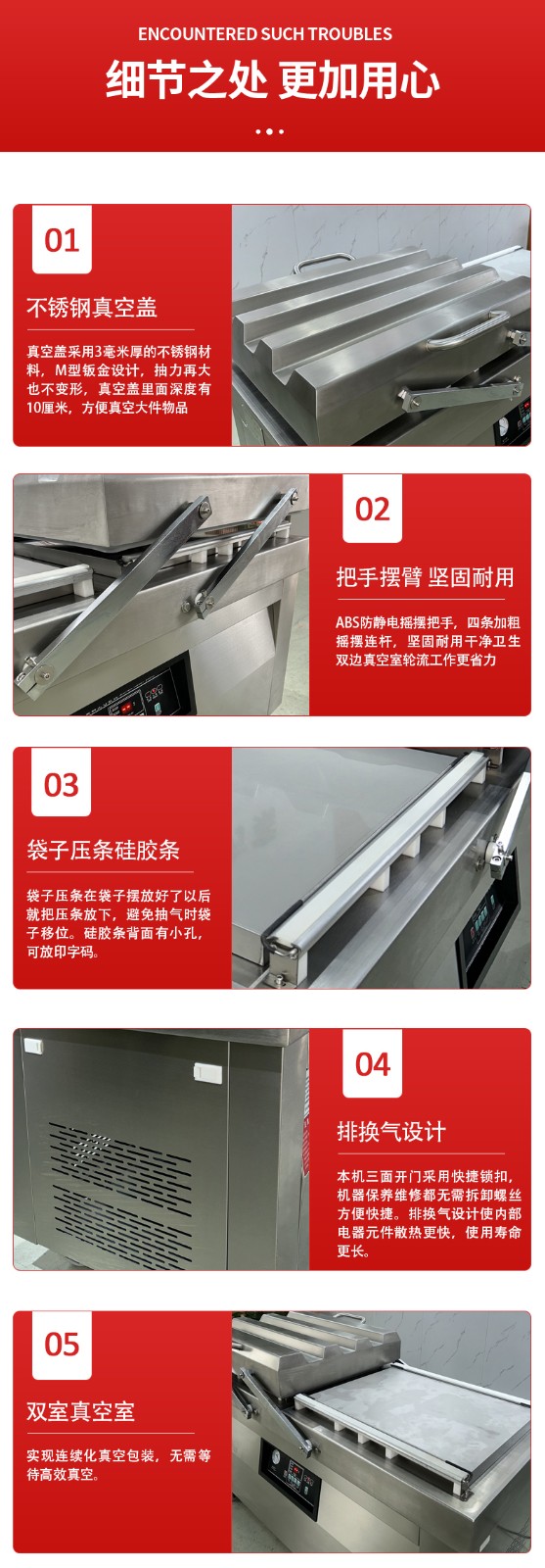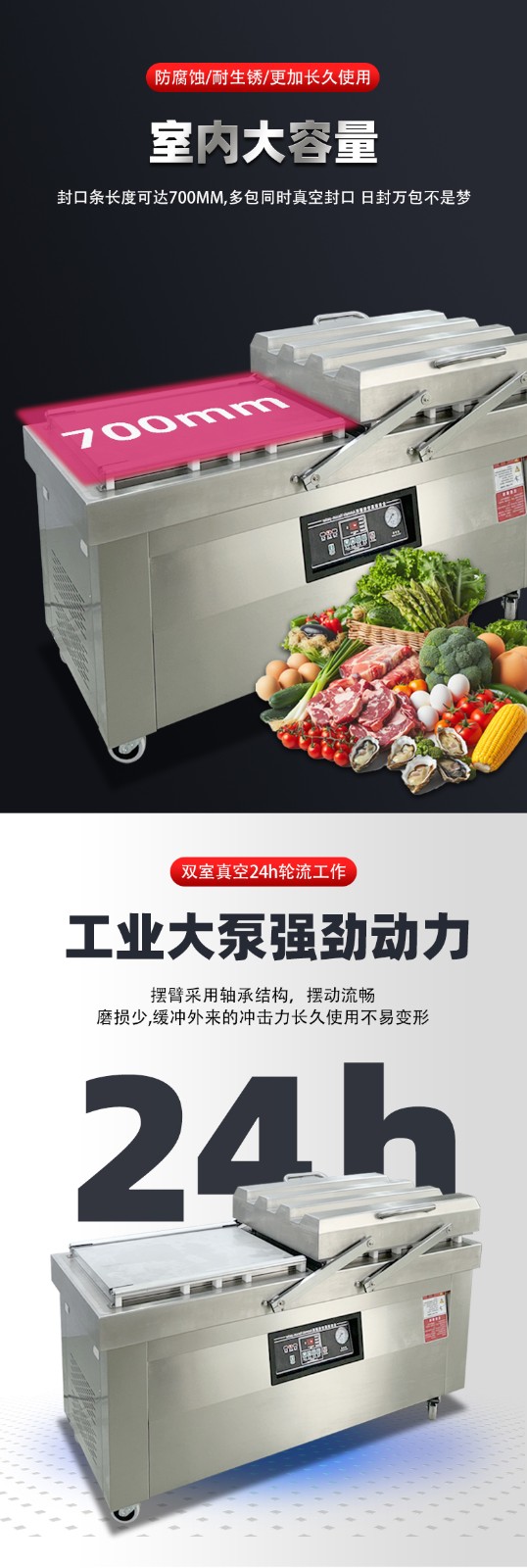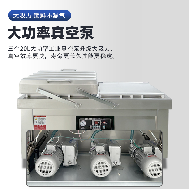 - 交替作業(yè),效率提升 50% 以上雙室機(jī)型的兩個(gè)真空室可實(shí)現(xiàn) “一工一備”:當(dāng)其中一個(gè)真空室正在進(jìn)行抽真空、熱封作業(yè)時(shí),操作人員可以在另一個(gè)真空室完成物料擺放、袋口整理的準(zhǔn)備工作。單室機(jī)型則必須等抽真空 - 熱封 - 開蓋取件整個(gè)流程結(jié)束后,才能進(jìn)行下一批物料的擺放,存在明顯的操作等待空窗期。同等規(guī)格下,雙室機(jī)的單位時(shí)間包裝量是單室機(jī)的 1.5-2 倍,尤其適合中小型加工廠的連續(xù)批量生產(chǎn)。