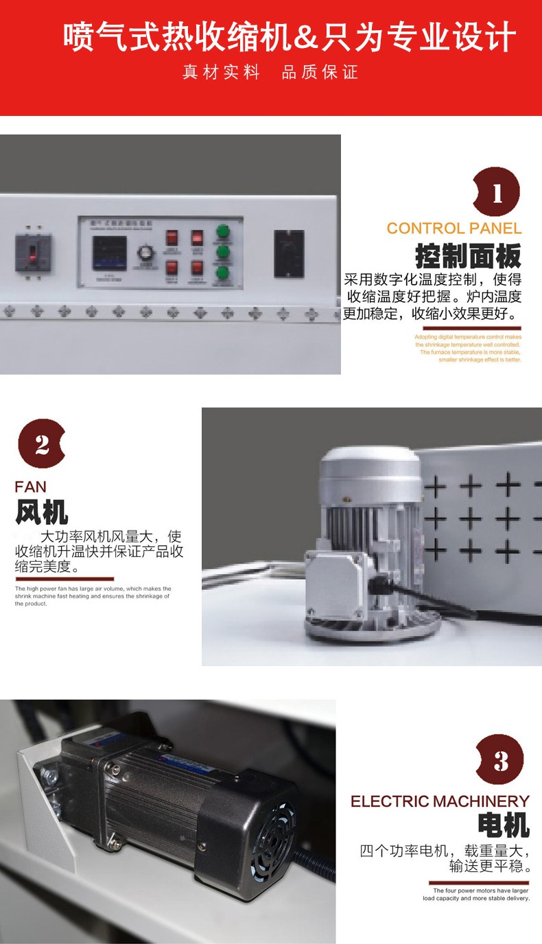 • 加熱系統(tǒng):這是噴氣式熱收縮機(jī)的核心部分之一。它通常由加熱管、溫度控制器等組成。加熱管一般采用石英加熱管或不銹鋼加熱管,能夠快速產(chǎn)生大量的熱能。溫度控制器可以精確地調(diào)節(jié)和控制加熱溫度,以適應(yīng)不同類型的熱收縮薄膜和產(chǎn)品的要求。例如,對(duì)于不同厚度的薄膜,需要設(shè)置不同的加熱溫度,一般溫度范圍在 100 - 300℃之間。