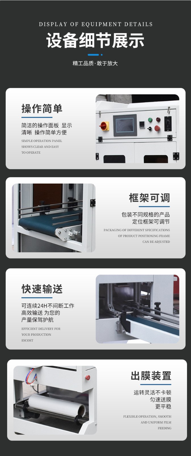 - 適用范圍廣:可以適應(yīng)多種產(chǎn)品的套膜需求。對于不同尺寸、形狀和重量的產(chǎn)品,只要在設(shè)備的規(guī)格范圍內(nèi),都可以進行套膜。同時,它也能夠使用多種類型的包裝薄膜,如 PE、PVC 等常見薄膜,企業(yè)可以根據(jù)產(chǎn)品的特性和成本等因素靈活選擇薄膜材料。