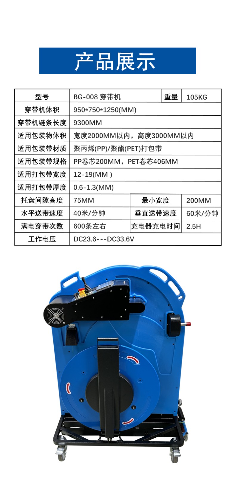 • 穿帶機(jī)是一種在包裝流程中起輔助作用的設(shè)備,主要用于將打包帶穿過被包裝物品周圍或包裝結(jié)構(gòu)中的特定位置,以便后續(xù)進(jìn)行打包操作。它可以被看作是包裝自動(dòng)化生產(chǎn)線中的一個(gè)環(huán)節(jié),能夠有效提高打包的效率和準(zhǔn)確性。