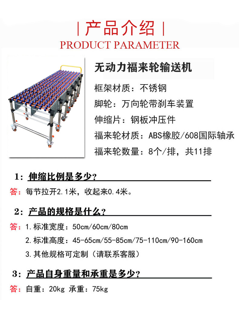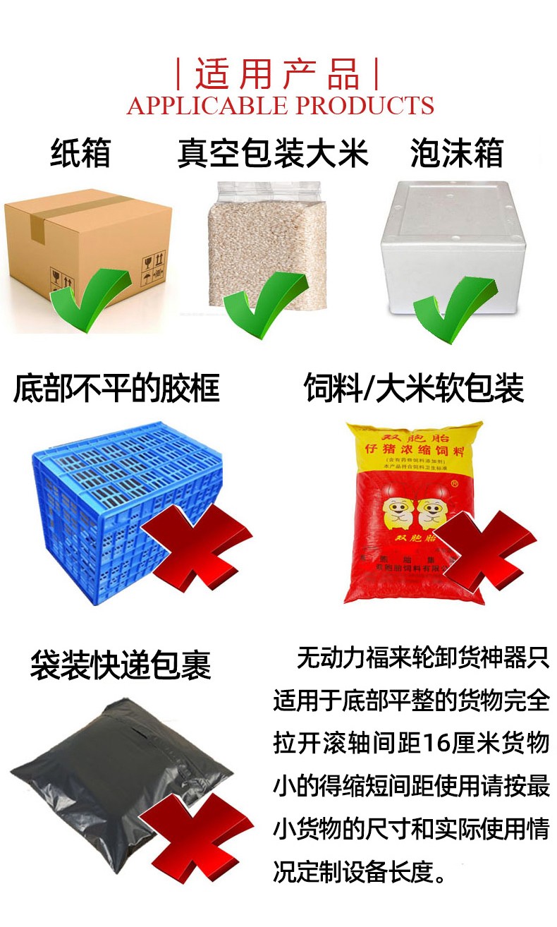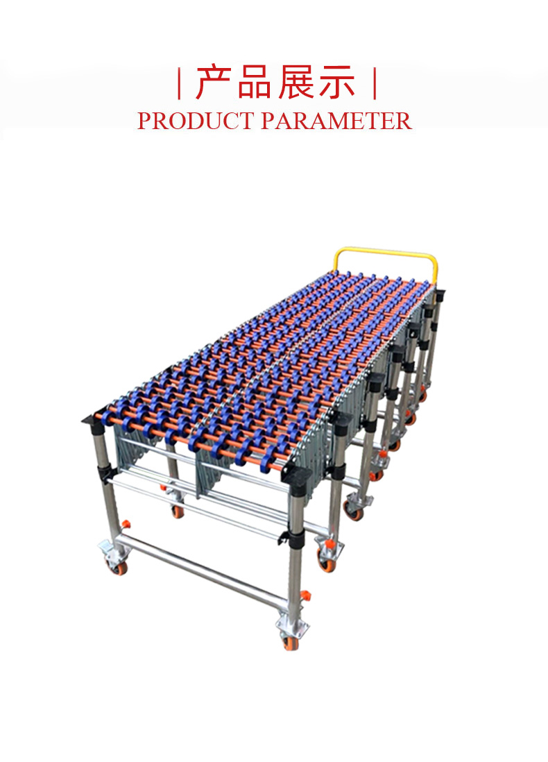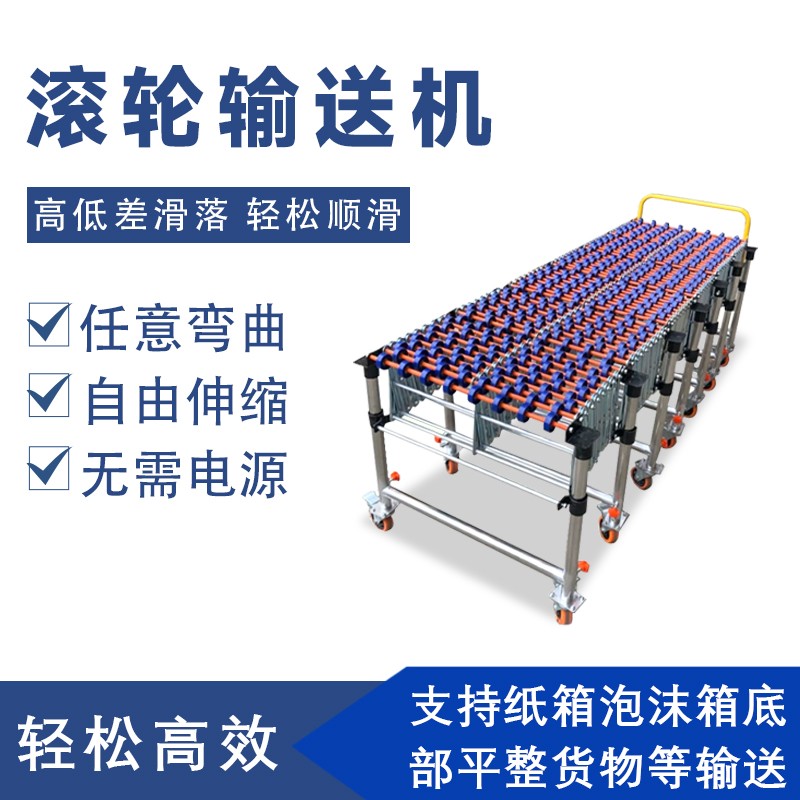 • 在無動(dòng)力滾輪輸送機(jī)中,當(dāng)物品放置在滾輪上時(shí),利用物品自身的重力在傾斜的輸送機(jī)上產(chǎn)生下滑分力,或者通過人工施加外力,使物品與滾輪之間產(chǎn)生相對(duì)運(yùn)動(dòng)。由于滾輪可以自由旋轉(zhuǎn),物品就在滾輪的滾動(dòng)下向前移動(dòng)。