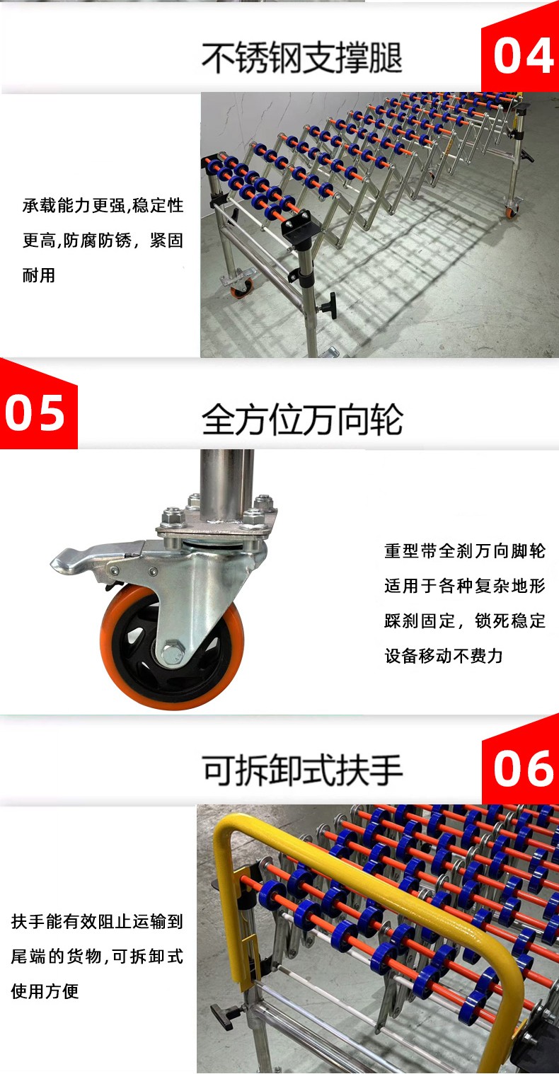 • 滾輪:這是核心部件,一般由金屬或塑料制成。金屬滾輪(如碳鋼、不銹鋼滾輪)具有較高的強(qiáng)度和承載能力,適用于較重物品的輸送;塑料滾輪(如聚氨酯滾輪)則具有較好的耐磨性和較低的噪音特性,常用于對(duì)噪音要求較高的場(chǎng)合。滾輪的直徑和寬度會(huì)根據(jù)輸送物品的大小和重量等因素來選擇。