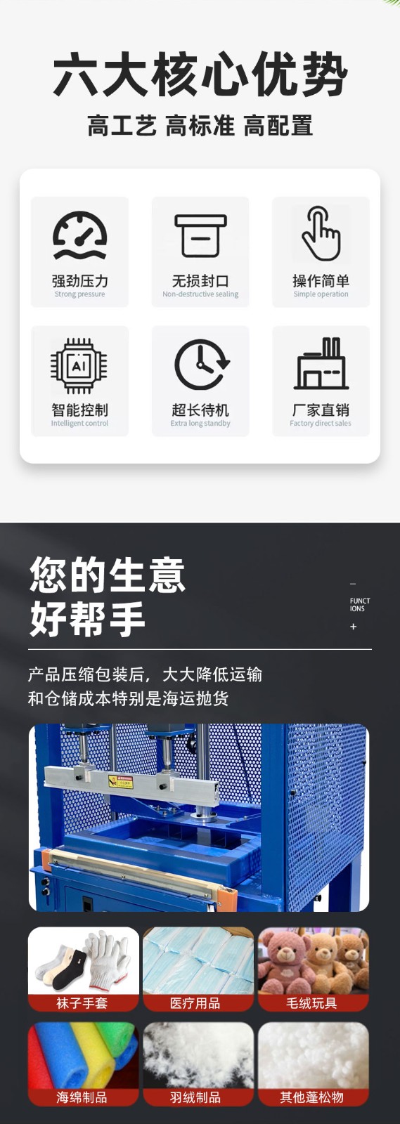 • 適應性強:可根據(jù)不同的產(chǎn)品尺寸、形狀和包裝材料,調(diào)整壓縮和封口的參數(shù),適應多種類型的產(chǎn)品包裝需求。