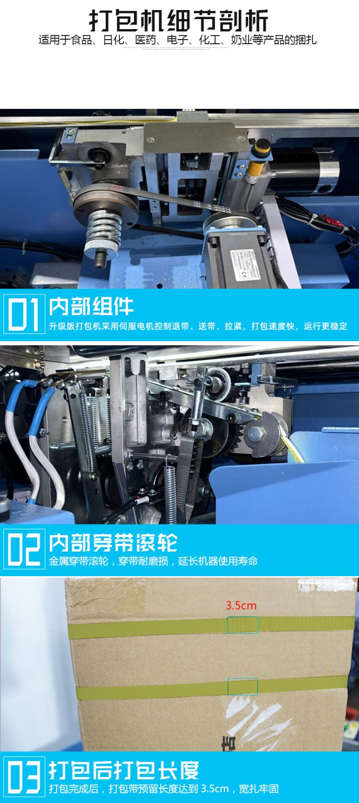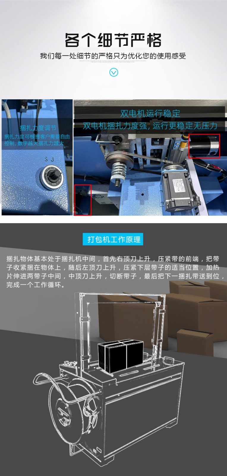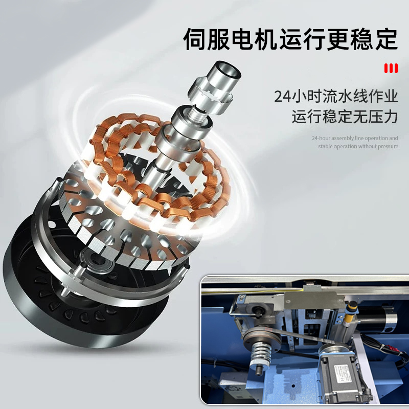 • 捆扎打包:根據(jù)預(yù)設(shè)的參數(shù),伺服電機(jī)驅(qū)動(dòng)打包帶圍繞物品進(jìn)行捆扎。在捆扎過(guò)程中,伺服電機(jī)精確控制打包帶的張力,確保打包帶能夠緊密地貼合在物品表面,同時(shí)又不會(huì)對(duì)物品造成損壞。完成捆扎后,切斷機(jī)構(gòu)會(huì)自動(dòng)將打包帶切斷,并對(duì)末端進(jìn)行熱封或其他方式的處理,防止打包帶松開(kāi)。