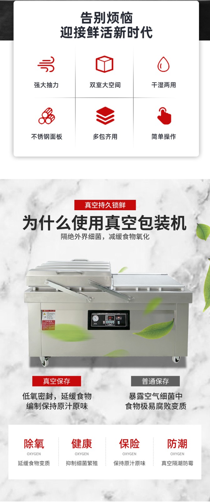 雙室真空包裝機通過 “雙真空室輪換作業(yè)” 實現(xiàn)抽真空與裝袋無縫銜接,核心是利用兩個獨立真空室的 “時間差并行操作”,讓設備在同一周期內(nèi)同時完成 “抽真空密封” 和 “人工 / 自動裝袋”,徹底消除單室機型 “抽真空時無法裝袋” 的等待間隙,大幅提升作業(yè)效率。其具體運作邏輯和優(yōu)勢可拆解為以下 3 點: