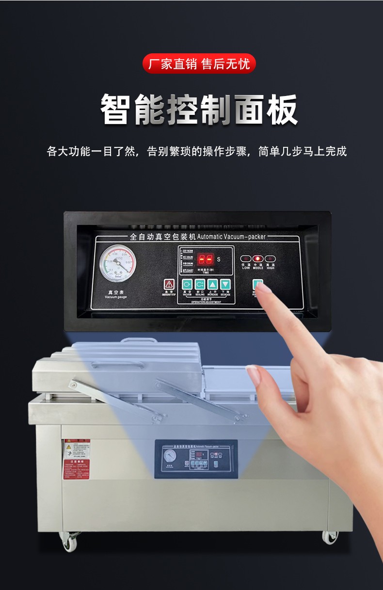 - 同一時間,右室真空蓋保持開啟,操作人員可同步將下一批待包裝產(chǎn)品放入右室包裝袋并擺好(即 “裝袋準備”),無需等待左室流程結束 —— 此時左室 “忙” 于抽真空密封,右室 “閑” 于裝袋,兩者并行不沖突。