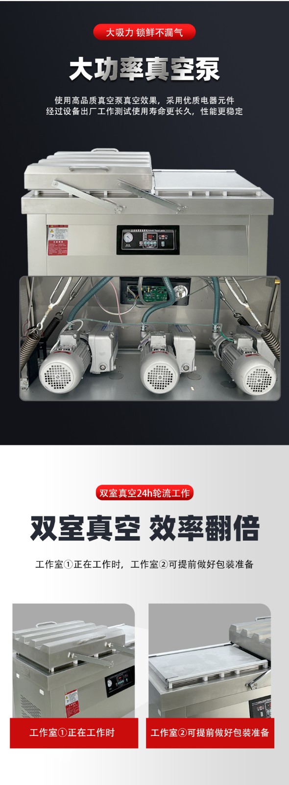 - 循環(huán)往復:左室、右室始終保持 “一室抽真空密封,一室裝袋準備” 的交替狀態(tài),兩個真空室的作業(yè)周期無縫銜接,沒有任何空閑等待時間。