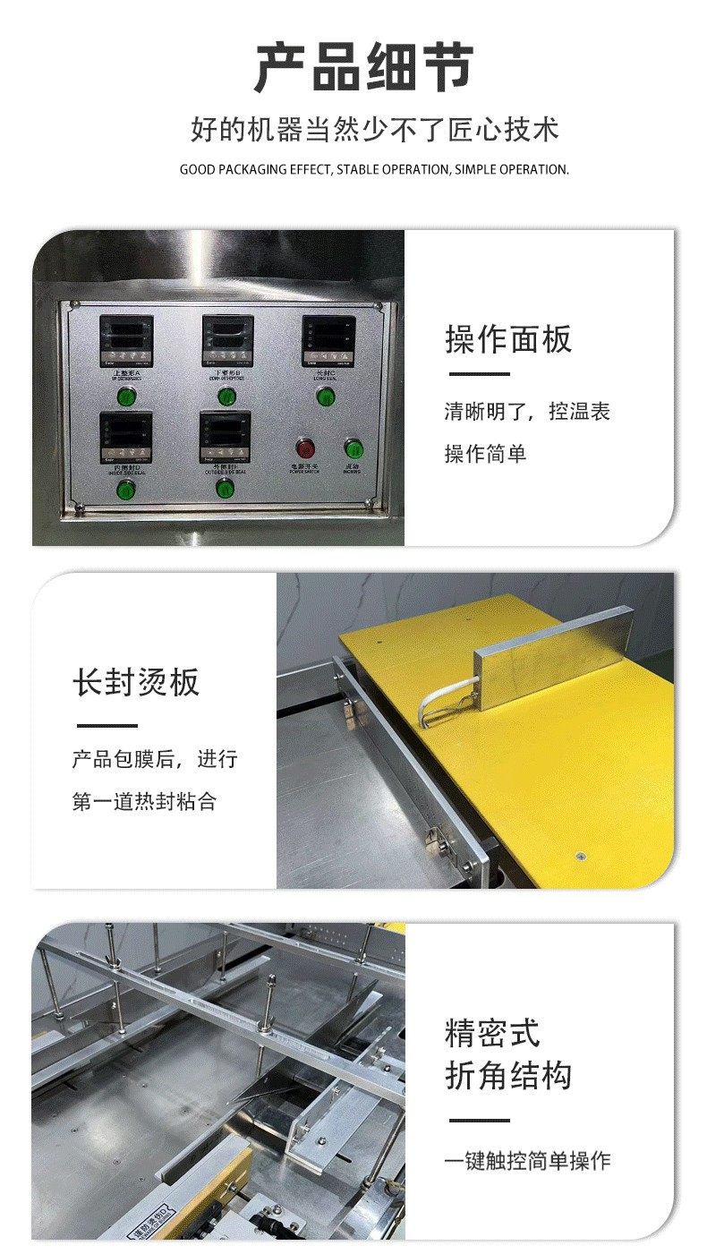 5. 折邊定型:封切后的產(chǎn)品進(jìn)入折邊工位,預(yù)熱裝置先對產(chǎn)品兩端的多余膜料進(jìn)行軟化(便于塑形),再通過機械折邊機構(gòu)(側(cè)折板、端折板)將膜料折疊、壓合,使包裝邊緣平整緊致,最終形成與產(chǎn)品形狀完全匹配的立體包裝;